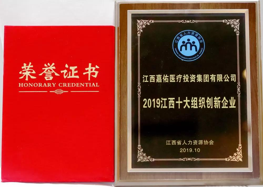 从江西省第四届人力资本高峰论坛暨2019江西人力资源盛典传来喜讯:江西嘉佑医疗投资集团通过严格的评选程序,经众多评委,荣获“2019江西十大组织企业”称号。